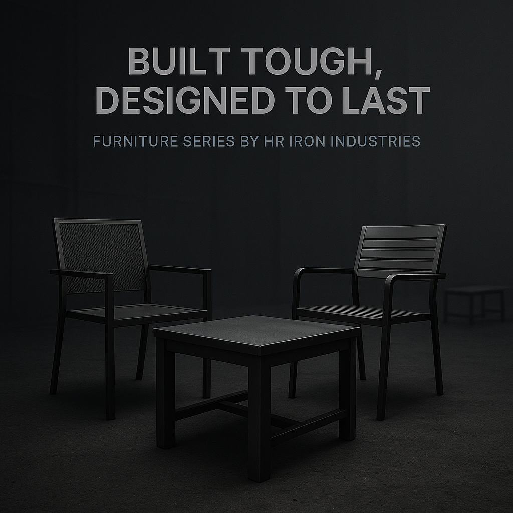 A digital composition highlighting Iron Chairs and Tables with a bold, minimalist style. These pieces are set in an industrial outdoor setting, showing strength and elegance. With reinforced joints and powder-coated surfaces, the visual captures the blend of utility and industrial charm — ideal for rugged environments and functional aesthetics.